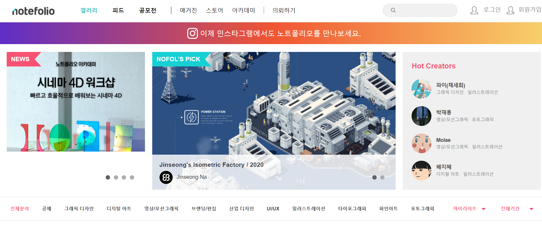 국내 디자이너님들의 작품을 만날 수 있다. 개인적인 생각으로는 젊은 작가분들이 많아 실험적인 디자인들을 종종 발견하는 재미를 맛볼 수 있다. 국내 디자인 트랜드를 파악하기 좋은 사이트다. 노트폴리오 내에서 진행하는 공모전이나 수업도 있어서 둘러보면 좋다!