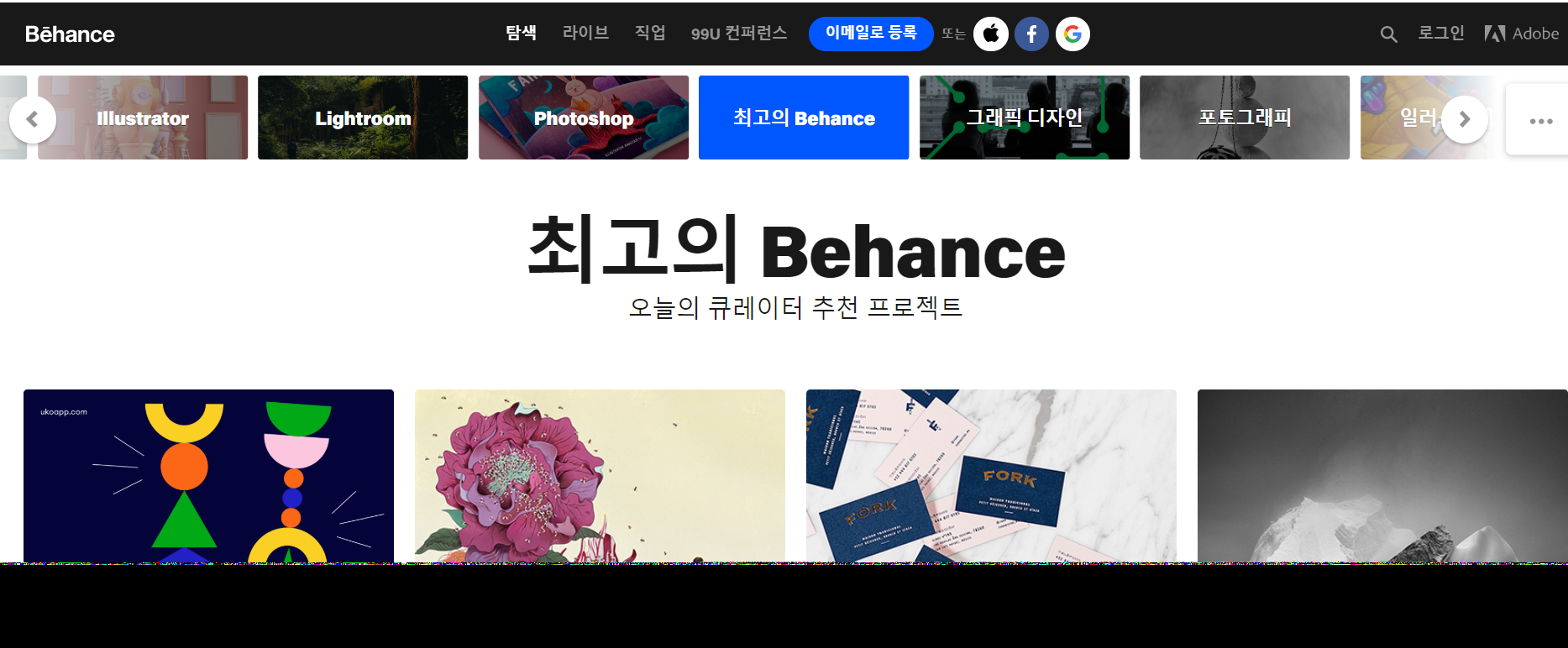디자인 포트폴리오만 모아진 사이트는 아니지만 디자이너, 작가 분들이라면 뗄래야 뗄 수 없는 사이트라고 생각한다. 검색을 통해서 다양한 포트폴리오, 회화, 일러스트, 사진등을 찾아볼 수 있는 최고의 사이트다.
